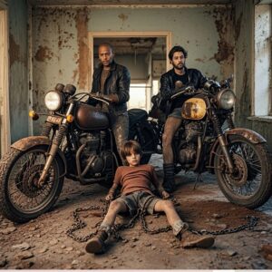 En un rincón de la habitación, un niño de unos cinco años estaba encadenado a un viejo radiador. Su mirada estaba fija en el suelo, dibujando en el polvo con su dedo, como si la presencia de seis moteros vestidos de cuero no lo afectara.