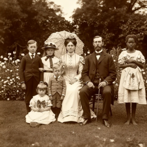 Su barba estaba cuidadosamente recortada. Sus manos descansaban sobre un bastón con empuñadura de plata. A su lado, de pie, una mujer sostenía una sombrilla de encaje sobre su cabeza. Su vestido era de seda clara, con botones de náar hasta el cuello y mangas abombadas. Cinco niños completaban el grupo, tres varones con trajes idénticos, una niña pequeña sentada en el suelo con un lazo enorme en el cabello, otra joven con sombrero de ala ancha decorado con flores artificiales.