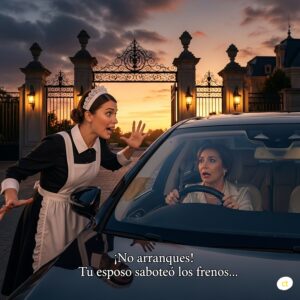 No arranques, tu esposo cortó los frenos”, gritó la sirvienta a la millonaria. “No olvides comentar desde qué país nos estás viendo. Laura, una mujer elegante y de mirada firme, había salido de la mansión con el seño fruncido después de una acalorada discusión con su esposo Julián. Él, un hombre de negocios tan exitoso como calculador, llevaba semanas mostrándose frío y evasivo, pero ese día las palabras cruzaron una línea peligrosa. Laura, cansada de humillaciones veladas y del desprecio con el que él trataba no solo a ella, sino también al personal de servicio, decidió irse a la ciudad sin avisar a nadie.