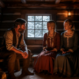 Sam había dormido en su silla junto al fuego, vigilando. Les había dado su cama a las mujeres y construido una cortina de mantas para su privacidad. La tormenta había enterrado el mundo afuera en un silencio blanco profundo. Elizabeth salió primero, su cabello oscuro trenzado ordenadamente, sus mejillas cálidas de nuevo por el calor del fuego.