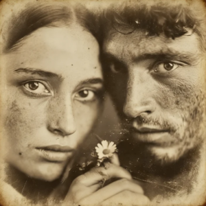 Gloria había logrado escapar de la vigilancia de su tía por un par de horas con la excusa de ayudar a su amiga a vender dulces. Fue allí, entre la multitud y el bullicio, que Santiago se acercó a ella. No fue con palabras, sino con una mirada profunda cargada de una extraña familiaridad. le ofreció una flor silvestre, una margarita arrancada del camino, un gesto sencillo, pero que para gloria significó una ruptura de todas las barreras invisibles que la rodeaban.