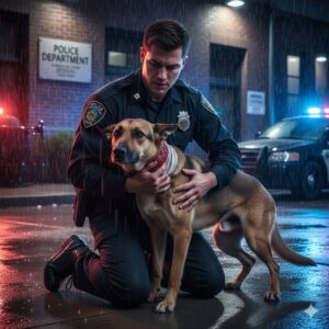 Cuando Ethan se agachó, el perro no reaccionó con miedo ni agresión. Avanzó lentamente y apoyó la cabeza en el pecho del oficial, como un náufrago que por fin encuentra orilla.