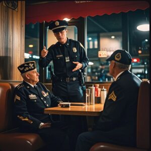 Todo comenzó en un típico restaurante de carretera donde dos veteranos afroamericanos, James y Walter, tomaban su café como lo hacían cada semana desde hace años. Vestían sus gorras militares con orgullo, recordando los días en que sirvieron a su país con valentía. Pero esa mañana algo cambió. Un policía local entró al restaurante y se acercó a ellos con una mirada de desprecio que incomodó a todos los presentes.