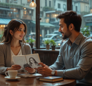 Luz cálida y ambiente íntimo. Prom de imagen escena dos. La misma cafetería. La chica sentada frente al hombre, ambos conversando animadamente, y ya con un cuaderno de dibujo abierto, el sonriendocon interés, lluvia visible por la ventana, tazas de café y detalles acogedores alrededor. Si quieres, puedo hacer una versión extendida con diálogos directos, incluyendo momentos de tensión emocional y gestos corporales para que tenga un más impacto cinematográfico y siga siendo 100 a 15 palabras.