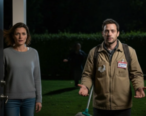 La luz del movimiento lo sacó de la oscuridad.  Chaqueta de trabajo descolorida, placa de conserje torcida y sujeta con un clip, un mango de trapeador todavía atado a su mochila como si se hubiera olvidado de dejarlo. “¿Qué estás haciendo en mi patio?” —exigió, con el corazón palpitando con fuerza. El hombre levantó las manos con las palmas abiertas.