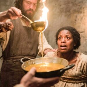 Lucía, al otro lado de la cocina, observó. Sintió el corazón latirle en el cuello. El amo, de pie, dijo con calma: “Recuerden, el orden empieza en el fogón”. Dominga cayó de rodillas. Cuando nadie la veía, Lucía se arrodilló junto a ella y colocó un paño húmedo sobre el hombro quemado. Un pacto sin palabras nació allí, entre el fuego y el miedo. Lucía miró el fuego y entendió que el mismo calor que destruye también puede forjar. El primer paso de la venganza no se dio con un cuchillo, sino con memoria.