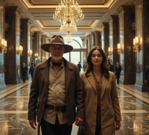 El lobby del hotel parecía un palacio moderno, pisos de mármol blanco, columnas brillantes y un aroma caro que flotaba en el aire. Las puertas giratorias se abrieron lentamente y dejaron entrar a una pareja que no encajaba con el lugar. El hombre era alto, delgado, con la espalda algo encorbada por los años de trabajo duro.