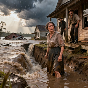 Diques rotos en Arcansas, pueblos enteros bajo el agua, miles de personas huyendo hacia terrenos altos. En River Ben comenzaron a aparecer familias desplazadas con carretas cargadas de muebles mojados y miradas vacías. Elizabeth los observaba en silencio desde su porche, consciente de que aquello ya no era una posibilidad lejana.