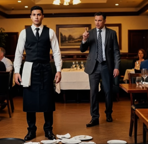 El sonido de una bandeja cayendo al suelo fue tan fuerte que atravesó todo el restaurante. Los platos se rompieron en pedazos, las conversaciones se detuvieron, las miradas giraron y en medio del silencio incómodo, Javier Navarro se quedó inmóvil con las manos temblando y el corazón golpeando con fuerza contra su pecho.