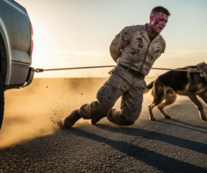 Las manos de Luke temblaban mientras sujetaba el volante. Su corazón martillaba contra sus costillas. Entonces vio algo más atado junto al marine, más pequeño, más inerte. Un perro. Un pastor alemán. Cat 9, sangrando, las patas desolladas hasta el hueso, apenas consciente mientras se deslizaba sobre el pavimento.