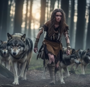 Luego, una tarde justo después del atardecer, los vio. Una manada de lobo salió de los árboles al borde del claro. Siete grandes, poderosos, moviéndose con calma segura. Y con ellos iba una muchacha. Se movía con la manada como si perteneciera ahí. A veces en dos pies, a veces en cuatro. La ropa era cuero rústico hecho a mano, el pelo largo y enredado.