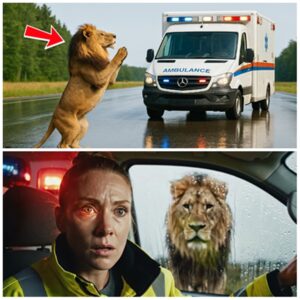 De vuelta en la ambulancia, intentó subir. Lisa dudó, luego asintió al conductor. “Deja que se quede cerca”. La puerta se cerró, la sirena sonó y el vehículo aceleró por el brillante camino mientras el león corría a su lado, negándose a quedarse atrás.