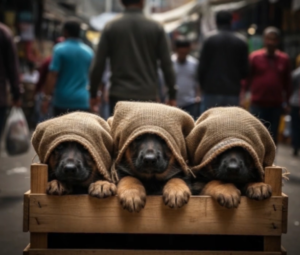 No era un sonido fuerte, no era un peligro evidente, era algo más silencioso, más profundo, una pequeña caja de madera arrinconada, casi invisible para todos. Y dentro de ella tres cachorros de pastor alemán temblando con la cabeza cubierta por sacos ásperos. Un letrero simple decía tres perros, $1. La gente pasaba de largo.