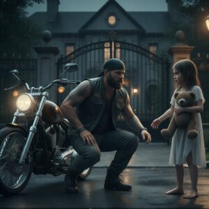 Un motociclista frenó de golpe a las 3 de la madrugada cuando una niña descalza salió corriendo de la mansión de su padre millonario, con el camisón empapado y abrazando un peluche desgarrado. Me suplicó que la pusiera a salvo, y en ese instante comprendí que el dinero puede esconder el poder… pero no la verdad.