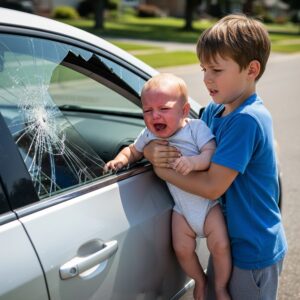 Sin dudar un segundo más, tomó una piedra pesada del suelo y golpeó el cristal con todas sus fuerzas. El vidrio se rompió y la alarma del coche se activó. Metió la mano con cuidado y sacó al niño que lloraba.