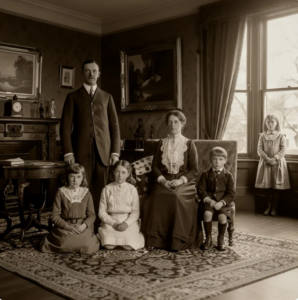 Una foto familiar de 1910 parece inofensiva… pero mira al niño que está de pie junto a la ventana