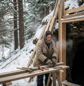 Lo fijó con cuñas de madera y barro mezclado con paja seca que luego apisonó con fuerza. Cuando el barro se congeló, el marco quedó sólido como si hubiera estado allí siempre. La puerta fue más difícil. No tenía bisagras suficientes ni madera uniforme. Al final usó dos cueros viejos. Uno de ellos había sido parte de un arnés de caballo cosidos con nervio y colgados de la parte superior del marco.