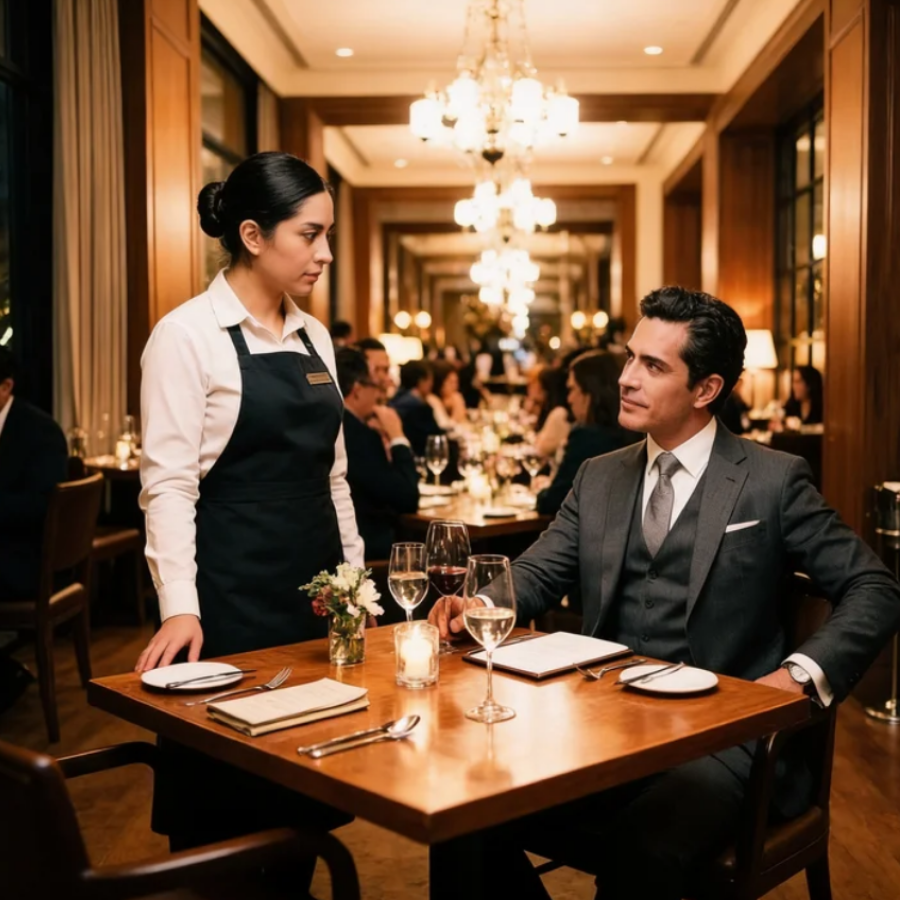 se acomodó en la silla, tomó aire y esperó el momento exacto. En su cabeza todo estaba planeado. No era solo pedir comida, era una forma de mostrar poder. Y aunque el restaurante seguía con su ritmo normal, con conversaciones y sonidos de platos y copas, Javier sentía que estaba a punto de iniciar algo más, algo que según él lo iba a colocar en una posición aún más alta frente a todos los que lo rodeaban.