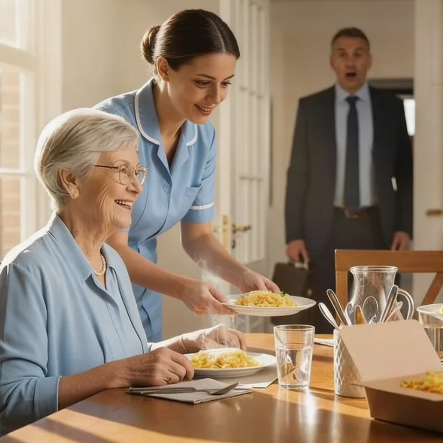 directamente en el plato de porcelana fina de la anciana. Sobre el costoso mantel ya no había insípidos purés verdes, suplementos líquidos ni fríos pastilleros médicos. Solo un banquete maravilloso y sencillo, rebosante de sabor, calorías necesarias y felicidad pura compartida. Pero sin lugar a dudas, el cambio más monumental, asombroso y definitivo de toda la hermosa escena fotorrealista no estaba en la deliciosa comida servida sobre la mesa, sino en el hombre que por fin había decidido dejar de observar su propia existencia desde