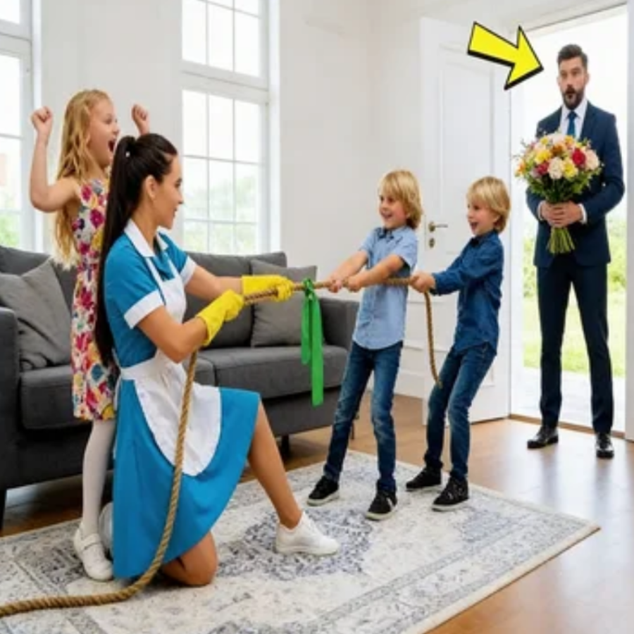 El millonario llega temprano a casa ese día abre la puerta con cuidado, sin hacer ruido, queriendo sorprender a sus hijos, pero lo que ve lo deja completamente sin palabras. En medio de la sala, su empleada doméstica está de rodillas, sosteniendo una cuerda gruesa. Del otro lado, sus dos hijos gemelos tiran con todas sus fuerzas, riendo a carcajadas.