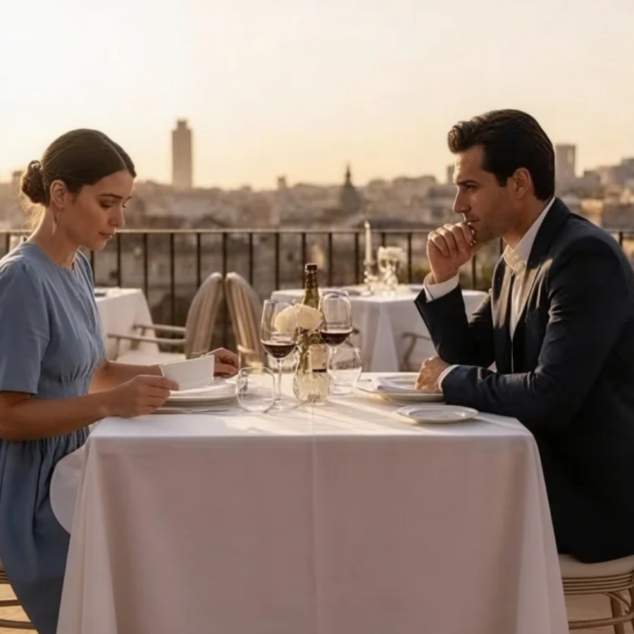 Se ha hecho prestar un bolso de su compañera de piso y ha usado todos los trucos de maquillaje que conoce. Debe parecer una mujer de éxito con un novio perfecto. A las 20 horas en punto llega al restaurante La Azotea, un local de lujo en el piso 40 con vista panorámica sobre Madrid. Está nerviosa, tiene las manos sudorosas y repite mentalmente la historia que ha inventado.