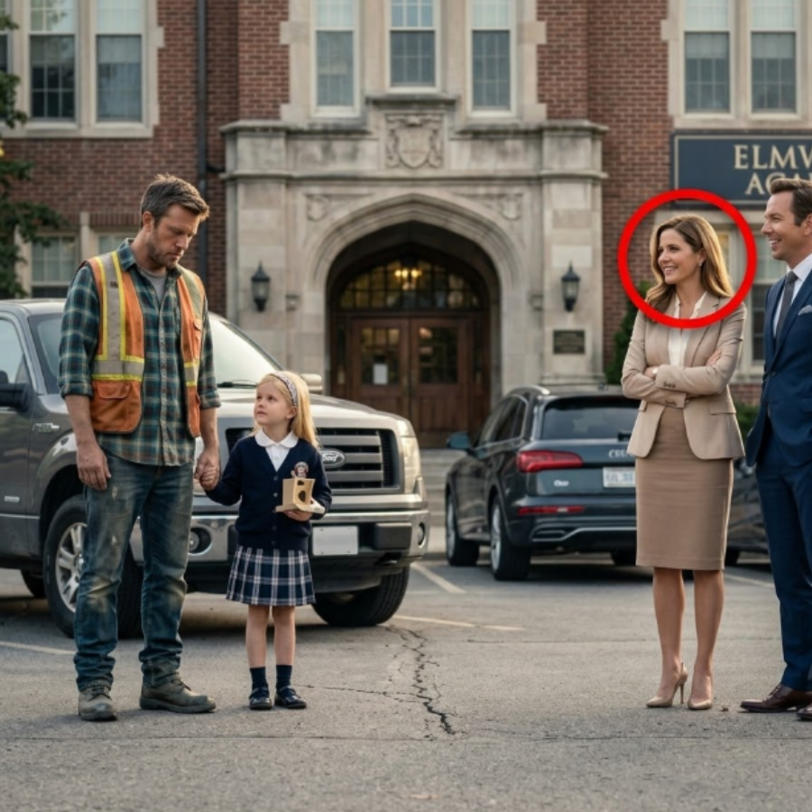 Se ajustó la correa de la mochila rosa desgastada de su hija sobre el hombro y forzó una calma que no sentía. Sus botas de trabajo estaban limpias pero gastadas. Sus jeans tenían una tenue mancha de polvo de yeso que se le había pasado esa mañana. Había venido directo de una obra de remodelación al otro lado de la ciudad porque Elena le había suplicado que no faltara al día de las profesiones.