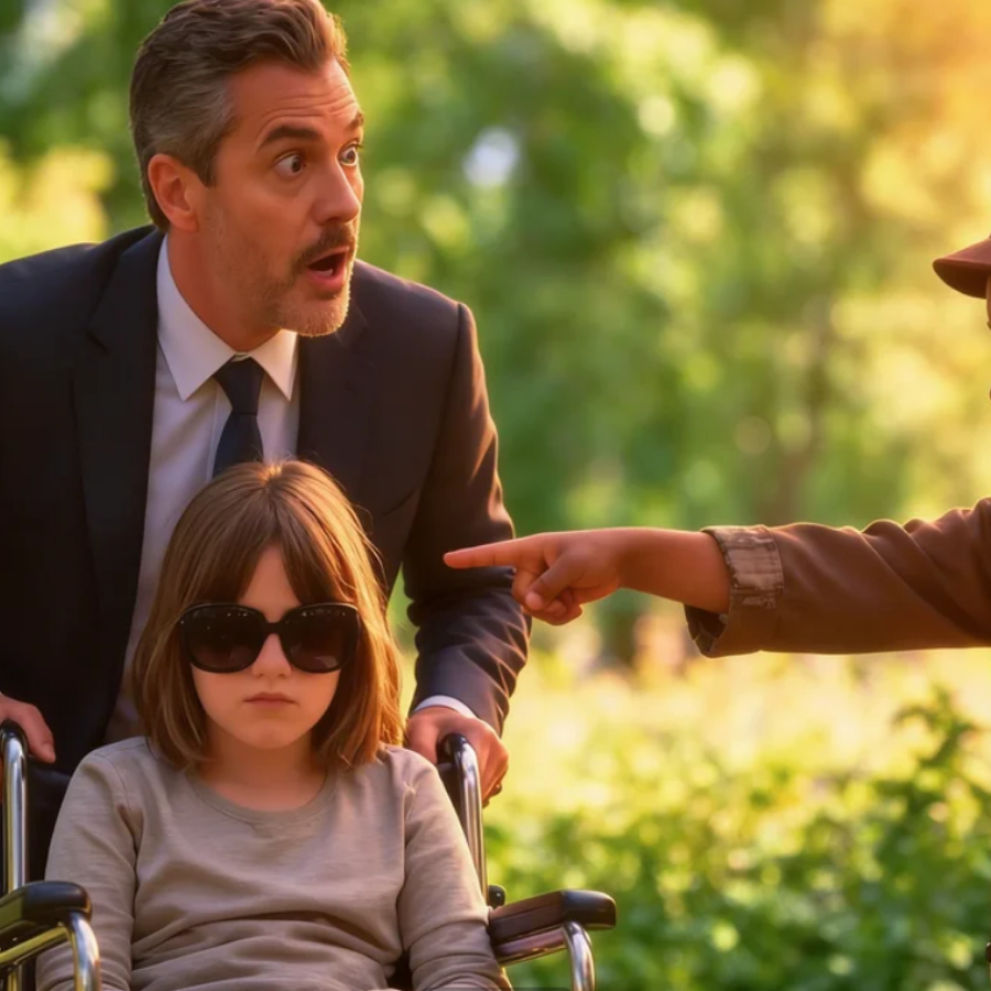 Su pequeña hija estaba sentada en silencio, con gafas oscuras ocultando los ojos que los médicos decían que nunca volverían a ver luz ni color. Años de hospitales, especialistas carísimos y oraciones sin dormir resonaban en su mente como gritos crueles y sin respuesta. Lentamente se inclinó hacia el chico con la ira subiendo rápido, pero el miedo ya estaba rompiendo su poderosa voz.