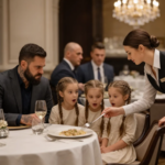 Habían pasado 40 minutos y las tres todavía no habían parpadeado fuera de ritmo. Valentino estaba sentado con su brancino enfriándose frente a él, el teléfono boca abajo sobre la mesa. No lo miraba. Miraba a sus hijas con la clase de agotamiento que viene de perder la misma batalla durante años. Luna dijo en voz baja, extendiendo el brazo hacia la niña más cercana.